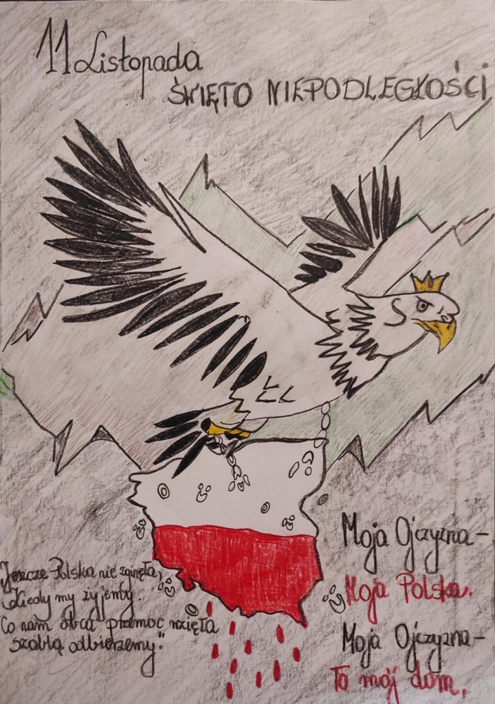 Uczniowie naszej szkoły wzięli udział w Powiatowym Konkursie Plastycznym „Moje Święto Niepodległości”, organizowanym przez Muzeum Historyczne w Lubinie. W konkursie zaprezentowało swoje talenty 15 młodych artystów z klas 4–7, przygotowując prace plastyczne ukazujące, czym dla nich jest Polska i jak rozumieją narodowe święto.