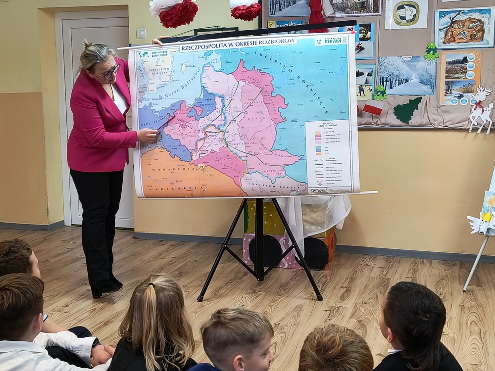 Szczególnym gościem wydarzenia była pani Elżbieta Sołtysiak – nauczyciel historii, która w ciekawy i przystępny sposób przeprowadziła rozmowę z uczniami o rozbiorach Polski oraz trudnej walce naszego narodu o niepodległość. Dzięki jej opowieściom uczniowie ze świetlicy mogli lepiej zrozumieć znaczenie tej rocznicy i dlaczego warto pamiętać o naszej historii.