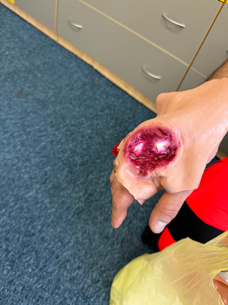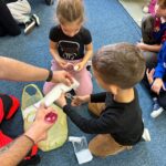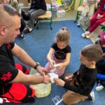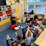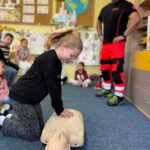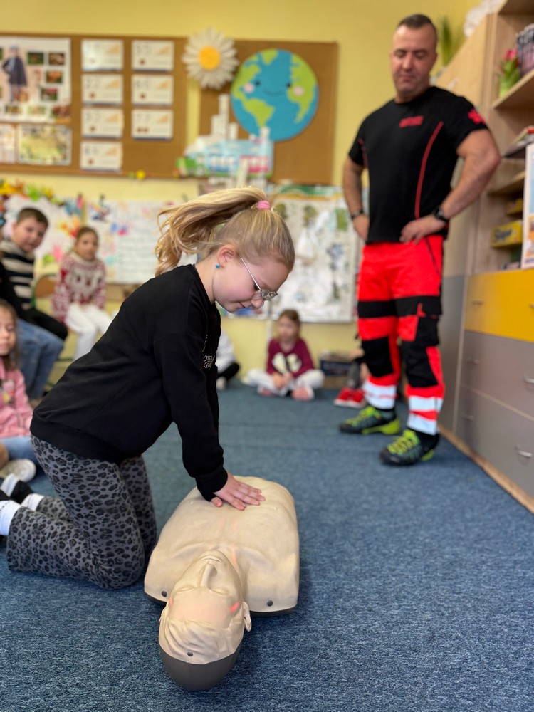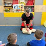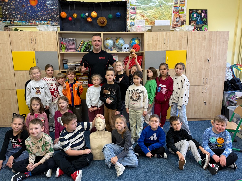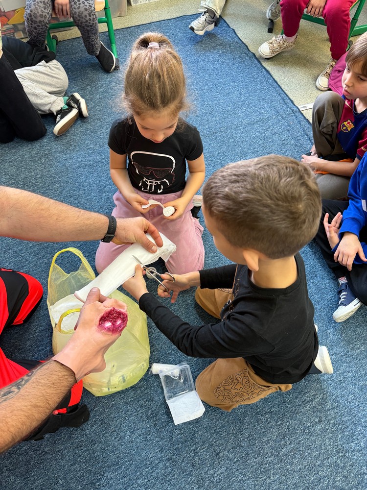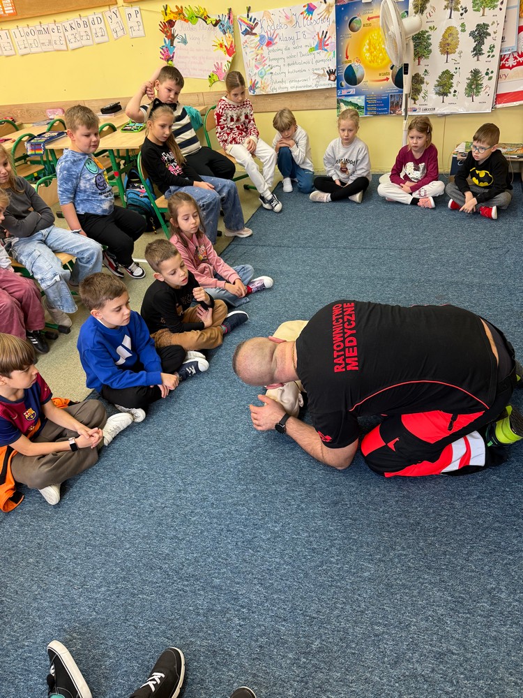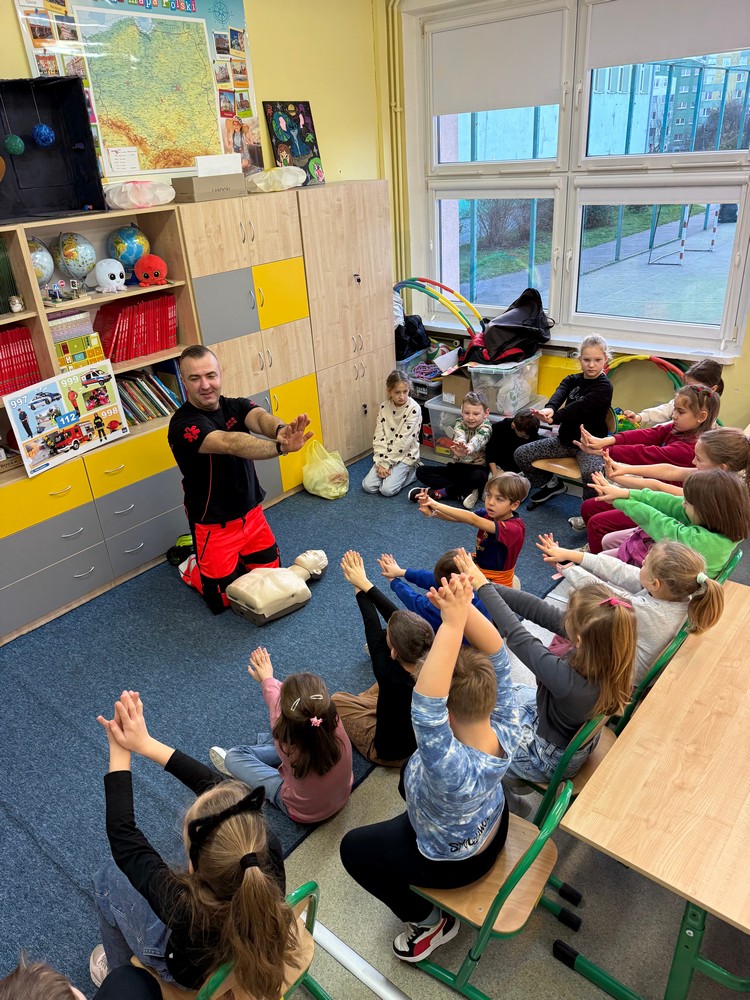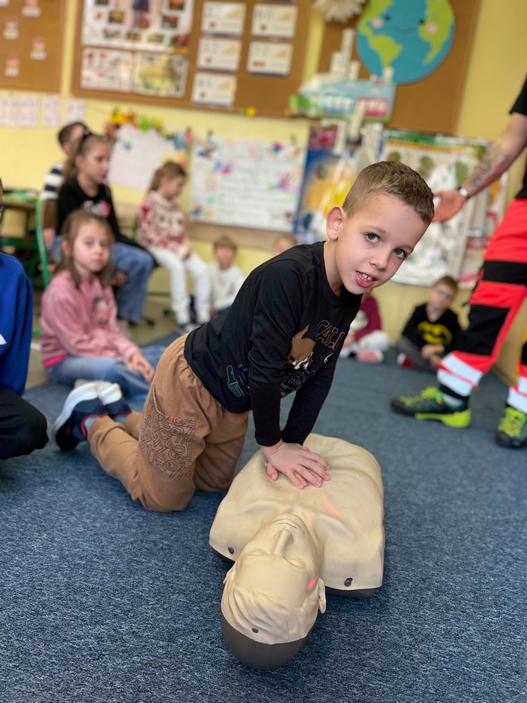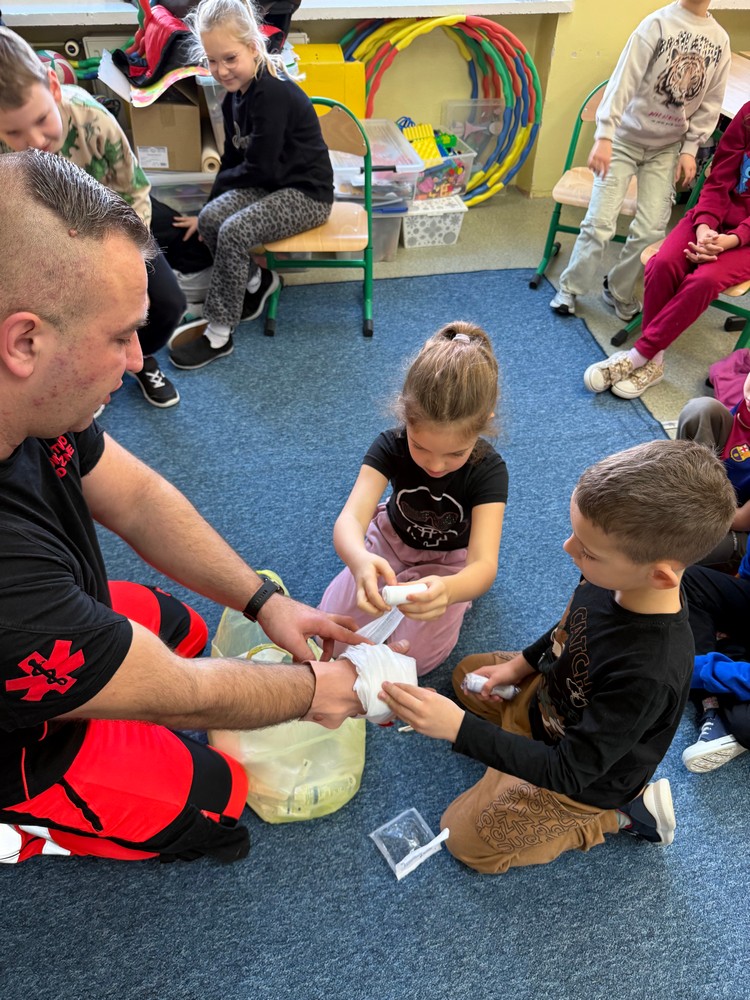 W klasie I B odbyło się wyjątkowe spotkanie z zaproszonym gościem – ratownikiem medycznym. Uczniowie mieli okazję poznać podstawy udzielania pierwszej pomocy. Dzieci ćwiczyły m.in. uciski, sprawdzanie przytomności poszkodowanego, opatrywanie rany przy użyciu specjalnej „sztucznej ręki” oraz przypomniały sobie numery alarmowe. Następnie uczniowie wcielili się w rolę zgłaszających zdarzenie i dzwonili na numer alarmowy, ucząc się prawidłowego przekazywania informacji.