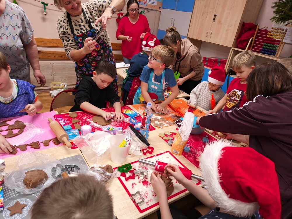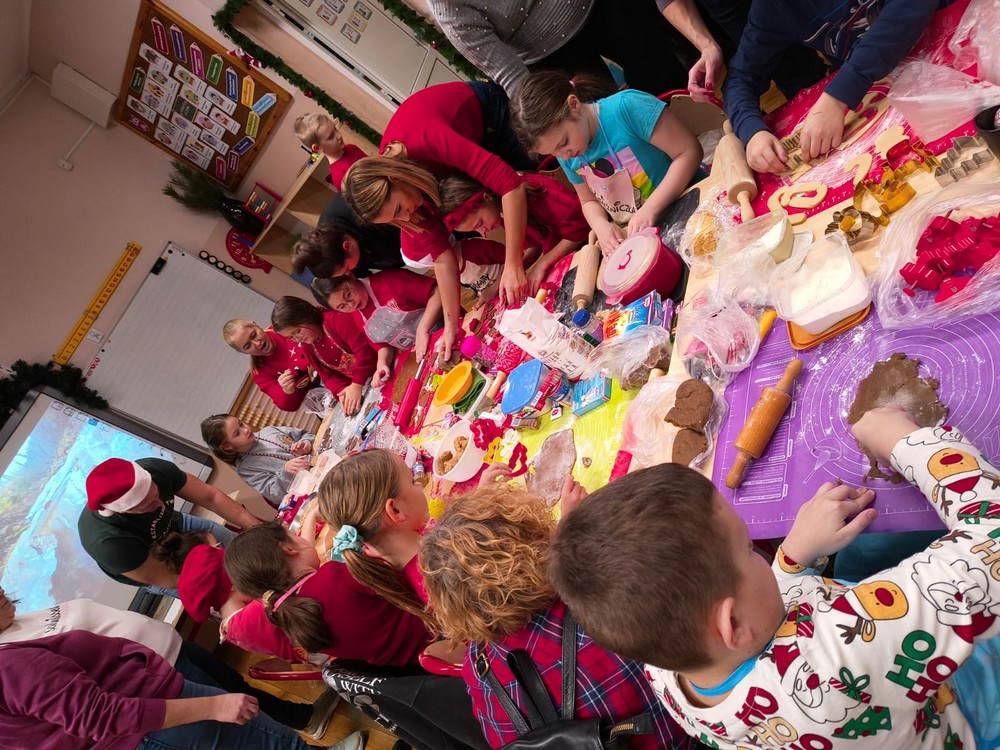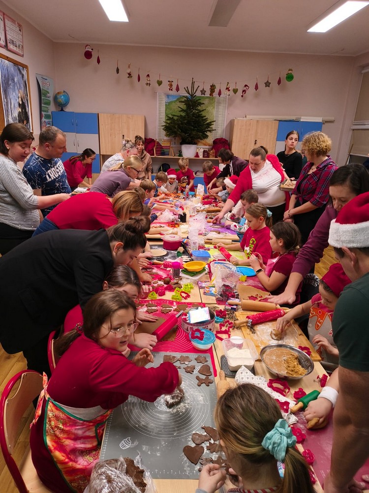 Grudzień to okres przedświąteczny, który nierozerwalnie łączy się z pieczeniem pierniczków. Uczniowie klasy II A wraz z Rodzinami postanowili trochę tego magicznego, świątecznego klimatu wnieść do szkoły. W piątkowe popołudnie 5 grudnia 2025 roku szkołę wypełnił zapach korzennych przypraw. Mamy i babcie dużo wcześniej przygotowały ciasta z miodem i przyprawami. W miłej atmosferze dzieci wałkowały, wykrawały foremkami (choinki, gwiazdki, renifery). Rodzice zajęli się wypiekiem. Po ostygnięciu wszyscy zabrali się z ogromną frajdą za dekorowanie pierników lukrem i kolorowymi ozdobami. Oczywiście skosztowanie własnoręcznie wykonanych, pachnących pierniczków było największą przyjemnością. Pieczenie i dekorowanie pierników bardzo się podobało dzieciom i wprowadziło nas w magiczną atmosferę świąt Bożego Narodzenia. Kolejne wypieki już za rok…