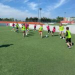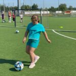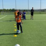 Uczniowie bardzo chętnie przystąpili do rozgrzewki, po czym przystąpili do ćwiczeń doskonalących technikę prowadzenia piłki slalomem, podania wewnętrzną częścią stopy i strzału na bramkę.